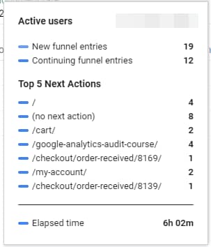 When you create a funnel in GA4, one of the options in the settings panel is next action. That will show you a list of the most common actions users in the funnel took as their next step. Here’s an example from our own site, of users who triggered the begin_checkout event—when they add a course to their cart to purchase.